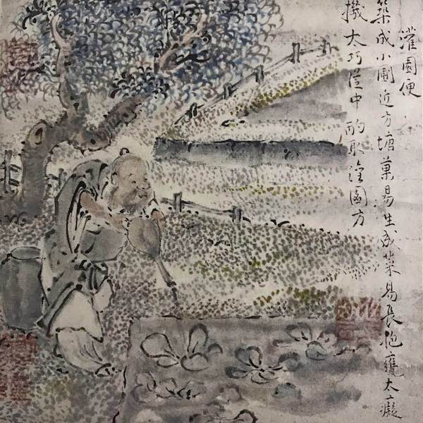 在一番勤奋刻苦地师古、师造化之后,池大雅对于南宗披麻皴有了自己的理解,他基本上用笔多偏锋,皴法极简,且善于用水,即笔肚蘸水,笔尖蘸墨,已到达湿润的笔触感。树石大都阔笔而写,树叶用密集工整的小点来描绘,点景人物在寥寥数笔之间,憨态可掬,可爱生动。