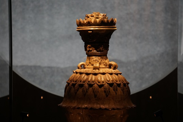 出土于南京灵山南朝大墓的青瓷莲花尊是迄今为止发现的存世莲花尊中体型最大、制作最精美的器物,被誉为“青瓷之王”。该器物出土时为一对,六朝博物馆展陈其中之一,这件青瓷莲花尊通高85厘米,口径21厘米,胎色灰白,釉色青绿,上有莲瓣形盖。