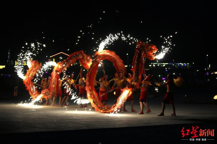 8:30,天完全黑了下来。广场上响起“舞龙”的音乐,两条龙上台缓慢舞动起来。舞着舞着,龙身上火星四射,舞龙的节奏迅速加快,欢呼声四起。音乐渐缓,接着停了下来,舞龙队推出舞台。