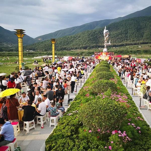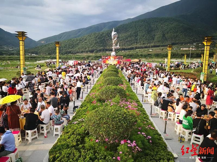 傍晚的灵山星月广场,数百张桌子,依次排开。数千人聚拢,在山水之间,细品冕宁正宗老九碗和地方特色美食。