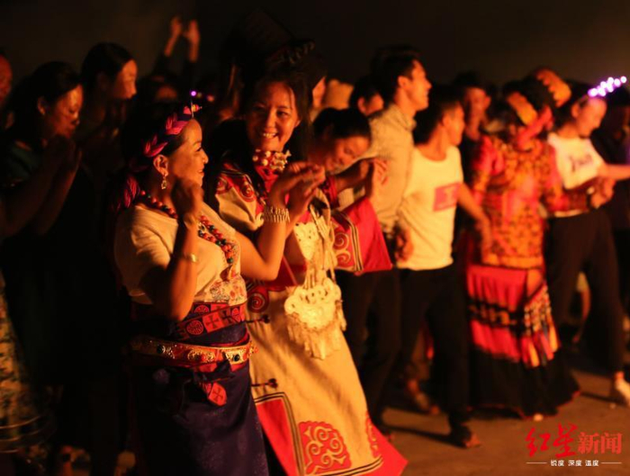 民族歌舞表演由彝族舞蹈《踩毡女》拉开序幕。一群天真活泼的彝族少女,着红裙、戴“奥法(彝族少女的帽子)”随着音乐起伏,曼妙起舞,腾挪跌宕。她们时而围成圈、时而散开去、时而走成一条线……