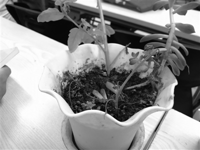 小区的陈女士把孩子种的多肉带过来了,花盆里不仅有多肉,还养了一颗西红柿苗,自从今年在多肉盆里种了西红柿苗后,两个都越来越不行,根都已经枯黄了。经过咨询,才知道多肉喜干旱,不能经常浇水,而西红柿水分要多一点。但如今也不能将二者分盆,现在分盆会伤根,应该在西红柿小的时候进行移根。目前,只能这样养着了,此外,浇水也不能太勤,得等西红柿缺水了才能进行浇水。