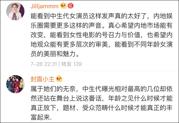 刘若英、吴越、陶昕然等诸多中年女演员转发支持“女演员宣言”,称其“说出女演员心声”。