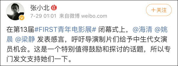在28日举办的第13届FIRST青年电影展闭幕式上,中国女演员海清代表“中年女演员”发声,恳求导演制片们给予出演机会,姚晨、梁静表态支持。