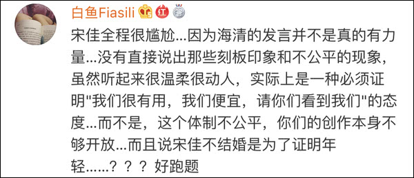 不过有网友强调,公众的关注点还是应该专注这些女演员大胆发声的诉求,而不是“鸡蛋里挑骨头”,挑剔海清的措辞。