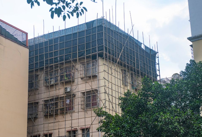 白云山西南门附近一幢楼宇正在搭建脚手架清理屋顶违建。
