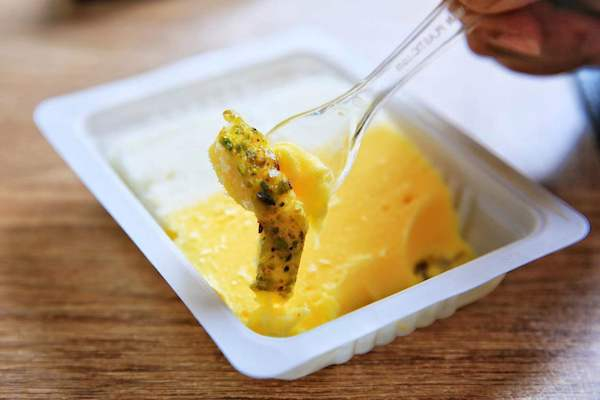 店主带着年轻的儿子在营业,见到我便绽放出波斯人一贯的热情笑容。语言不通,店主索性打开冰柜让我自选。一股冷气冲出来,喷了我满脸,神志都清明了几分。我挑了其他客人都在吃的黄白相间冰淇淋,少年仔细地把简陋的小盒子拿出来摆上桌,递过来塑料小勺。白色部分是奶味,黄色部分是开心果味,侧边还沾着细密的开心果碎。