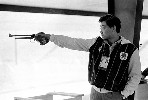 1984年7月29日,许海峰在第23届洛杉矶奥运会男子自选手枪慢射比赛中。(新华社)
