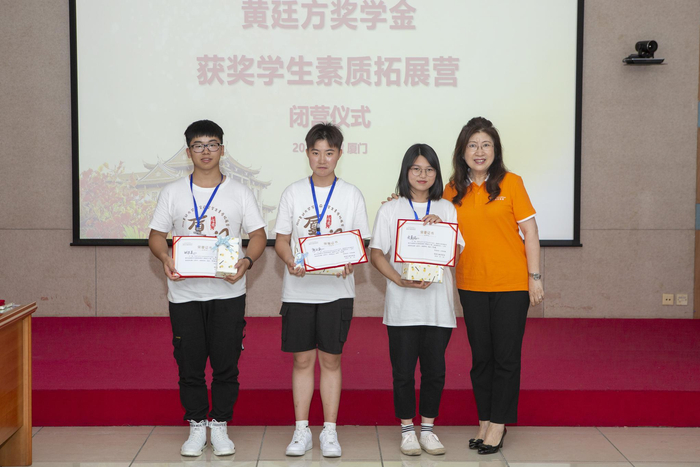 7月19日下午, 2019年“黄廷方奖学金获奖学生素质拓展营”闭营仪式于我校颂恩楼220报告厅举行,福建省委统战部副巡视员廖长桂,信和集团中国业务总经理黄若红,厦门大学党委常委、组织部部长、统战部部长孙理,厦门市学生资助管理中心、厦门市委统战部、厦门大学学生资助管理中心的老师及素质拓展营全体营员等70余人出席了闭营仪式。闭营仪式由厦门大学学生工作处副处长许美霞主持。