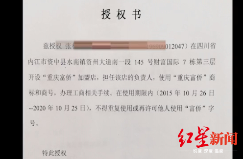 “他们也把授权书和转让手续都给了我们。”张女士在此案后向法庭提交的《授权书》显示,她被授权在资中县开设“重庆富侨”加盟店,使用“重庆富侨”商标和商号,使用期限5年,至2020年10月止。