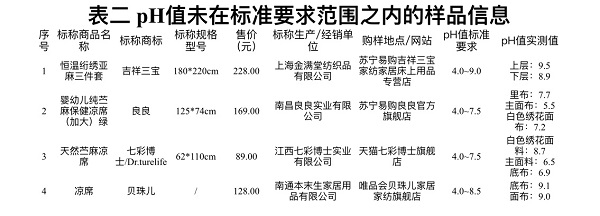 更令人心惊的是,针对婴幼儿的织物凉席,质量也存在问题。1件样品甲醛超标,3件样品PH值不合格。