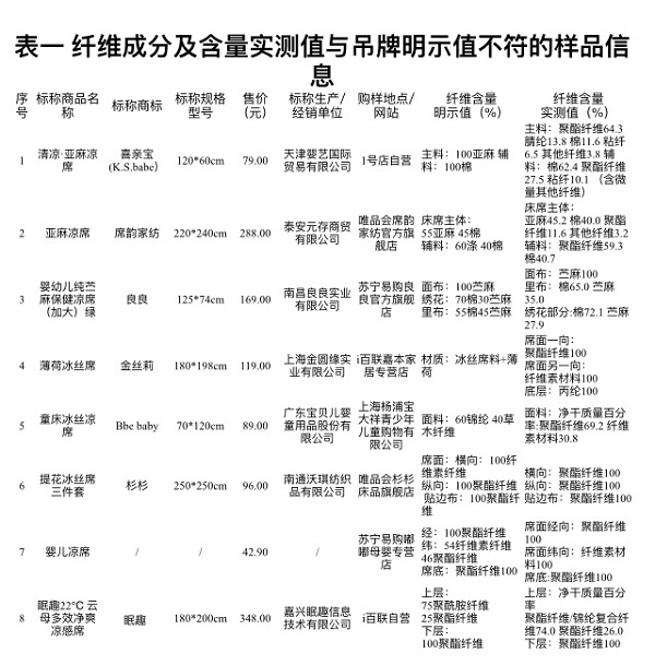 试验发现,有8件样品的纤维成分及含量实测值与明示值不符,主要包括虚标亚麻含量、成分名称不规范、成分标注错误等情况。比如,“喜亲宝”清凉亚麻凉席网页宣称“亚麻婴儿凉席”,吊牌写着“100%亚麻”,但实际竟一点亚麻成分都没有。