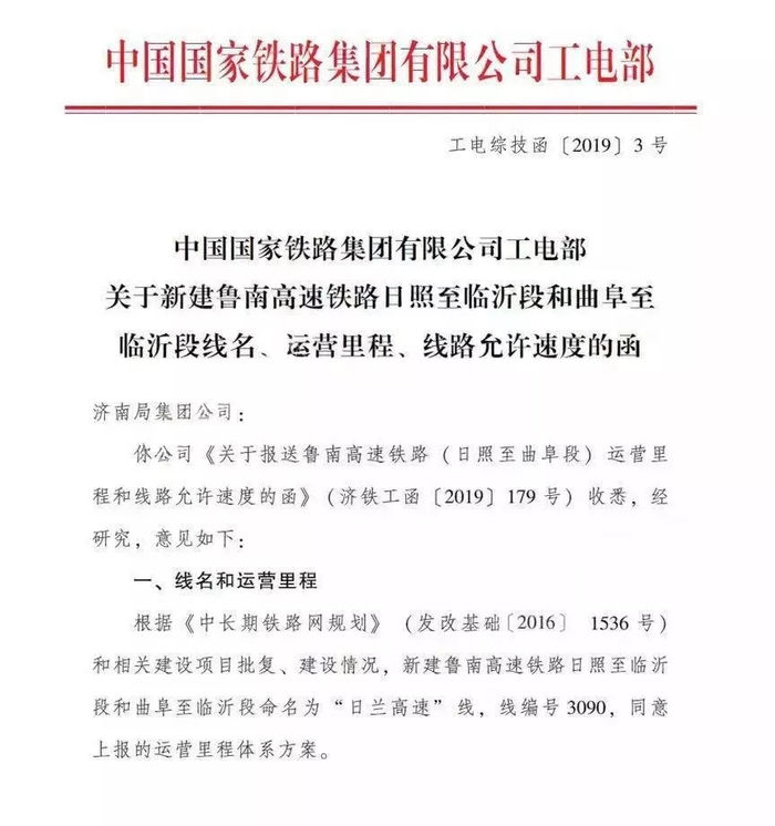 据“菏泽日报”微信公众号消息,中国国家铁路集团有限公司工电部关于新建鲁南高速铁路日照至临沂段和曲阜至临沂段线名、运营里程、线路允许速度的函显示:根据《中长期铁路网规划》(发改基础 [2016] 1536号)和相关建设项目批复、建设情况,新建鲁南高速铁路日照至临沂段和曲阜至临沂段命名为“日兰高速”线,线编号3090,同意上报的运营里程体系方案。