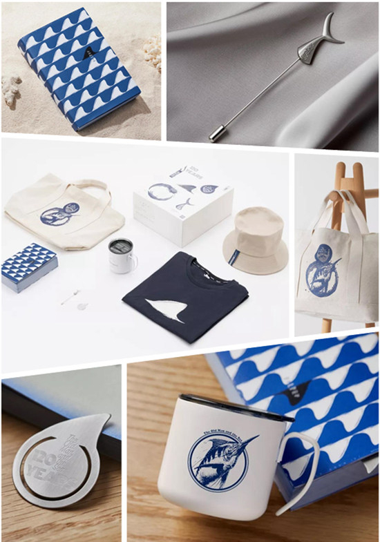 在开工前,陶雷看了《老人与海》,还找了海明威的其他作品来读,“文创,‘文’在前‘创’在后,必须要根基于文化,不能凭空而来。”书没有白看,陶雷更清晰地知道,海明威不仅是一个伟大的文学家,还是一个形象很硬朗的男性,所以在设计时,他用更简洁的元素和深沉的普蓝色来表现,金属制品则采用不锈钢拉丝或者磨砂的工艺,没有用光滑的表面,避免过于精巧而丧失粗犷和质感。