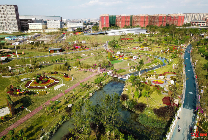 占地1800余亩的天府芙蓉园,坐落在双流机场起降航线之下,3万余株芙蓉花对公众免费开放。不仅有各种花卉,还充分借鉴海绵城市、循环经济等全新理念,加上定期举办的各种丰富的音乐节、赏花季、灯光秀等节会活动,这里更成为了都市微度假的休闲之地。