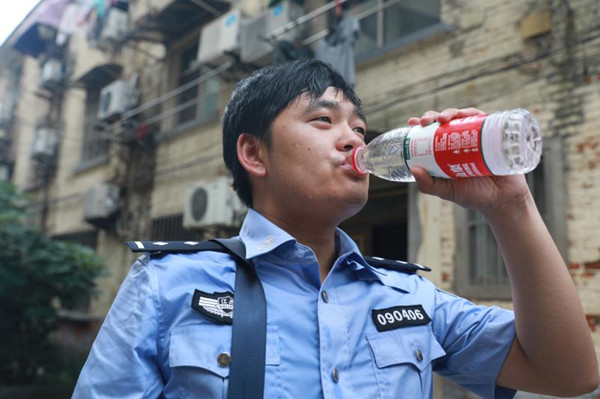 婉拒了胡大爷的再三挽留,李亚明他们又在该小区内连续“上门入户”12户。结束时,三人的衣服后面已经湿透。在各自一口气“灌”下一瓶矿泉水后,李亚明又立即带领辅警走向了辖区的沿街门市。