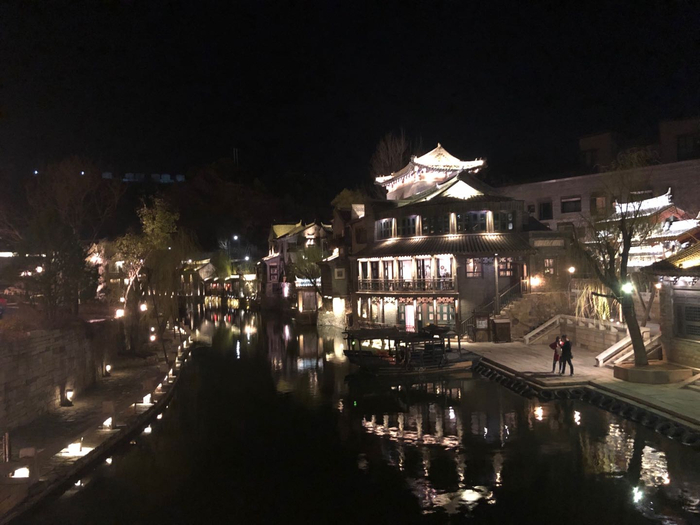 不过,也有人来到古北水镇从事生产。这里偶尔会被当作影视剧的取景地。在古北水镇景区的统一管理之下,根据剧情需要,各家店铺可以随时换个临时的招牌,街上则贴上各式民国广告或红底黑字的标语。若是幸运,刚好赶上景区拍戏,从挂着酒家招牌的服装店逛出来,就可能猛地望见,街角竟然坐了一大群解放军战士。于是便与群众演员们一道,悠闲又饶有兴味地观望着摄像机的缓缓移动。在民国风情的广告招贴画下,剧组的拍摄人员坐在墙角,端着吃了一半的盒饭,守着巨大的滑轨,似乎在等待下一道合适的光线降临。三、新式园林