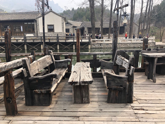 古北水镇上临水的茶座。据介绍,它们是用在水里浸过多年的江南船木重新晒干后所造,异常结实。