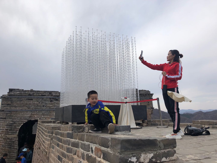 司马台长城是目前唯一一段开放夜游的长城,一对母子在设在长城上的灯柱旁拍照。