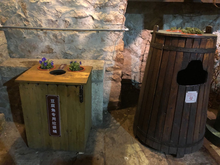这里不能开车,依靠脚步丈量,可以对距离和时间获得更为真切的感知。行走时不难发现,与常见的江南小镇的景区不同,这里没有随处可见的臭豆腐,或是大红大绿的店招,而是每种食物品类分布在景区的不同地带,店招设计则要么融入建筑当中,要么在差异之间形成和谐,甚至连小吃街上的垃圾桶,都根据摊点的不同吃食进行了特殊的设计——放竹签的、倒汤水的。为了避免重复、恶性的竞争,除几家连锁品牌外,景区内的食肆摊点几乎全由景区统一打理。民宿主的食物原料,也由景区统一供给。大家都是员工、合作者而非业主。