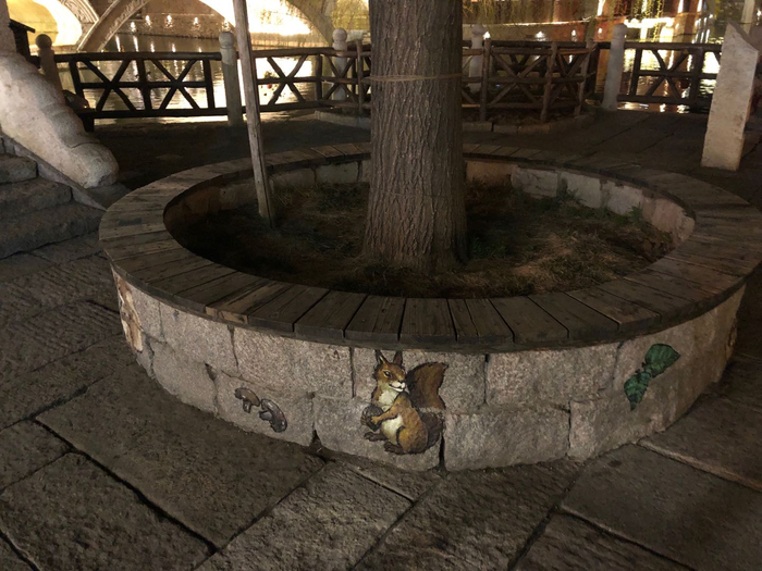 古北水镇商业街花坛上的卡通松鼠。它们是理解古北水镇的另一条线索。