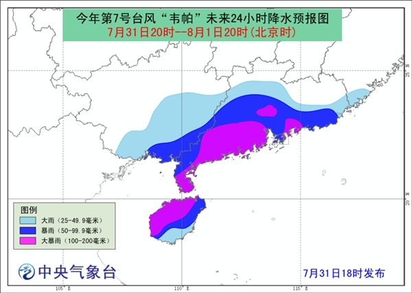 降水预报:7月31日20时至8月1日20时,广西南部、广东中南部、海南岛等地有大到暴雨,其中,广东南部沿海、海南岛西北部等地的部分地区有大暴雨(100~200毫米)。