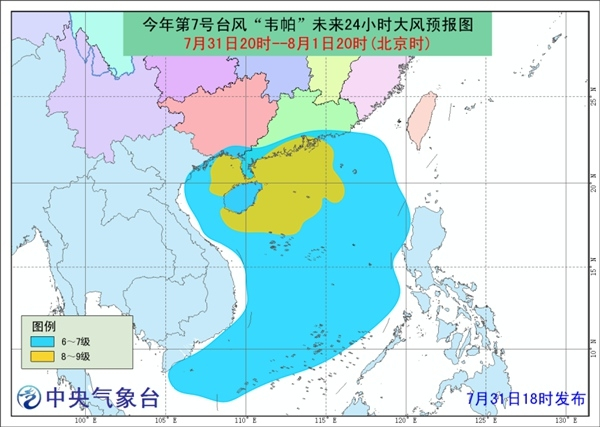 大风预报:7月31日20时至8月1日20时,南海大部、广东沿海、海南岛沿海、广西沿海、琼州海峡、北部湾将出现6-7级大风;其中,南海北部和中部的部分海域、广东西部沿海、海南岛东部和北部沿海、琼州海峡将有8-9级大风,北部湾北部的部分海域风力可达9-10级,阵风11-12级。