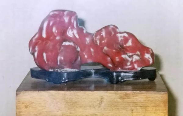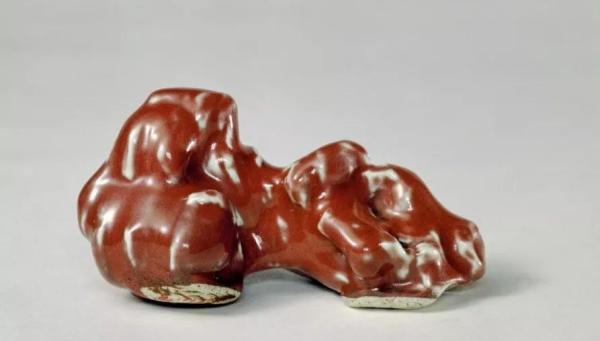 有一件“明嘉靖·鲜红釉宿鹅形笔山”,原先展示于陶瓷馆中,现在已经收置起来了。记得大概是在千禧年,我在故宫陶瓷馆(旧馆)看到这方陶瓷,标签名称为“明·嘉靖红釉鹅形笔山”(13.5x5.8x6cm),有原(旧)配木座,馆方描述“器型如一只卧鹅,通体施以红釉,棱角转折处露出白色胎骨”。当时就感觉这是一方仿山石造型的笔山,因为它根本不像鹅形,更多是一种抽象形状,而且后世也没有见过有鹅形笔架。后来,我在拙著《观赏石投资与收藏》(汉语大词典出版社2002年1月版)一书中,将此笔山照片收录其中,将“鹅形笔山”名称改作“随形笔山”,认为“这也是传世至今较早的一例仿造自然山石峰峦的工艺品”。