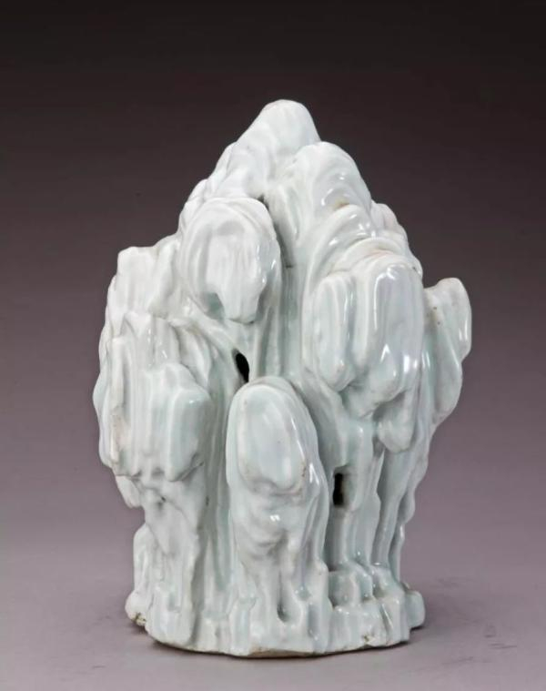 明代嘉靖年间,有关仿制自然山石造型的瓷器(其他材质的出现更早)工艺品开始出现,这可能也是当时赏石之风兴盛的一种表征。如广东省博物馆收藏有一方明·嘉靖“青白釉瓷太湖石”(高25.3cm),作竖立状山子造型,漏透有孔,肌理皱襞。这应该也是最早出现的瓷山子之一,与笔山造型各逞其美。故宫数字文物库中,还有一方“明嘉靖·冬青釉镂空笔山”,整个造型如同一座大山,肌理皱襞十分丰富,其中还有几处洞天,敦厚之中见变化。不过,这里所谓的“笔山”名称似乎有误,因为笔山通常是横峰造型,有凹陷处可以搁笔,而这座竖峰并无此种实用功能,应该称作“山子”更妥帖。