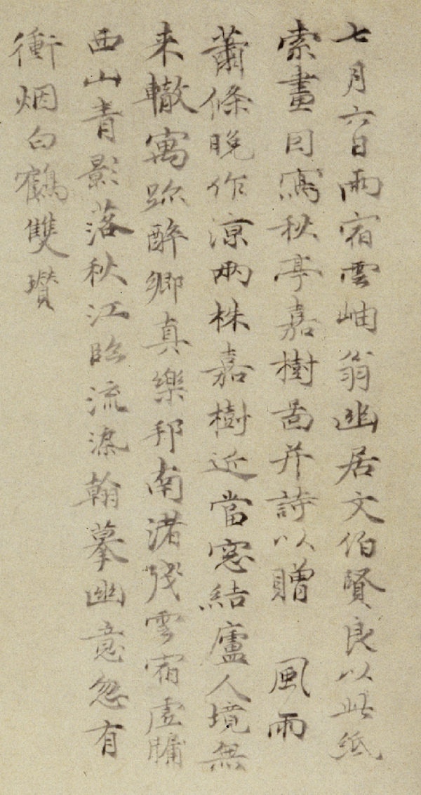 倪瓒的传世书法墨迹主要有如:《行楷书淡室诗轴》,此为倪最大字书法;《小楷书静寄轩诗文轴装卷》(图1),静寄轩是邾珪(伯盛)的斋名,此件作于洪武四年(1371年),倪瓒七十一岁,是其晚年书作。两件作品均藏于故宫博物院。此外还有一些诗文、尺牍存世,如:藏于故宫博物院的《楷书怀寄彝斋随寓二先生诗页》《楷书杂诗五首页》《寓法禅寺诗并札》《暑气帖》;藏于吉林省博物馆的《行楷书答教帖并诗页》《行楷书呈德机二诗帖页》等。
