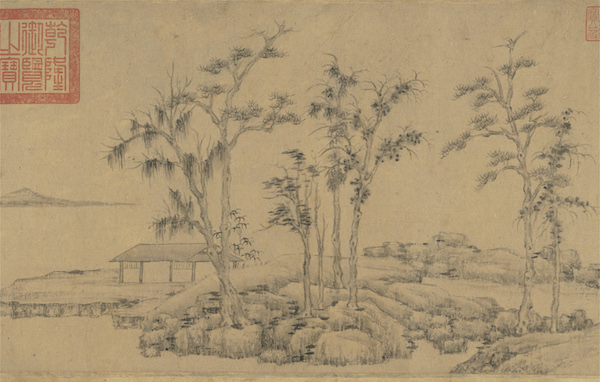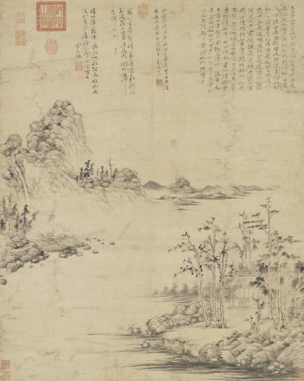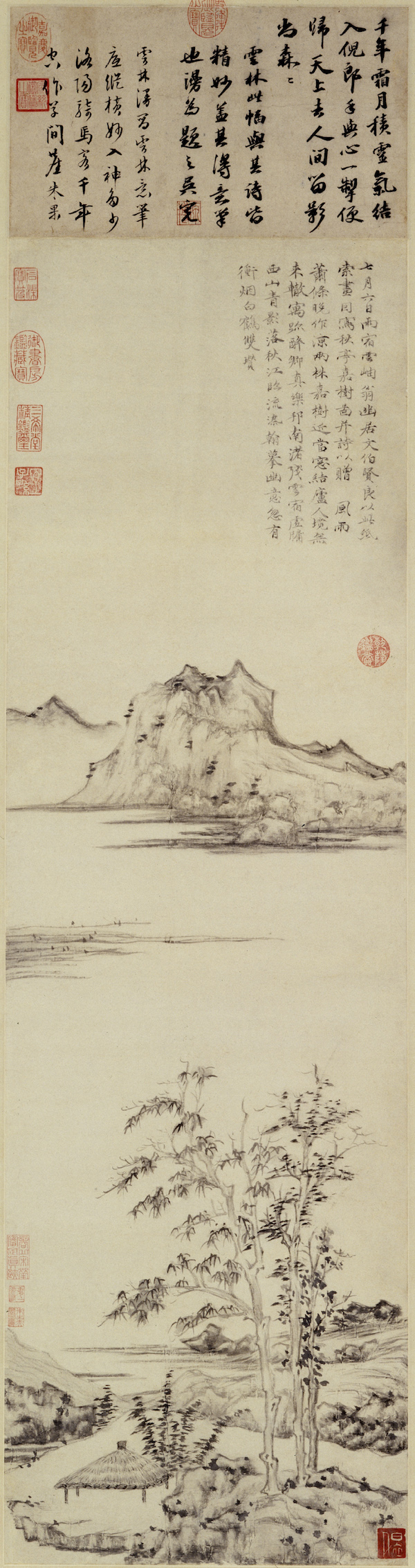 藏于美国大都会博物馆的倪瓒《虞山林壑图轴》充分表现了倪瓒那种画中有诗、诗酒言画的文人隐士幽趣格调。自题诗:“陈蕃悬榻处,徐孺过门时,甘冽言游井,荒凉虚仲祠。看云聊弄翰,把酒更题诗,此日交欢意,依依去后思。辛亥十二月十三日,访伯琬高士,因写虞山林壑,并题五言,以记来游。倪瓒。”