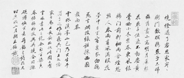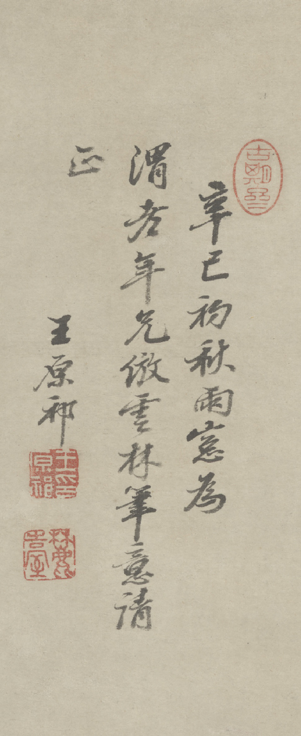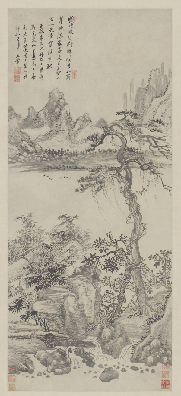 王鉴的山水多仿古之作,专心于元四家,更崇奉董、巨,其功力深厚,对倪瓒亦推崇备至,有《仿云林溪亭山色图轴》(藏于故宫博物院)题诗并跋:“烧灯过了客思家,寂寂衡门数暝鸦。燕子未归梅落尽,小窗明月属梨花。燕子低飞不动尘,黄莺娇小未禁春。东风绿遍门前柳,细雨含烟愁路人。春雨春风满眼花,梦中千里客还家,白鸥飞去烟波绿,谁采西园谷雨茶。 云林溪亭山色,乃其生平得意之作,向藏吴门王文恪家,今为王长安所收,此图上有云林书此三绝。余雨坐染香庵,绿梅初放,兴与境合,因涤砚漫仿其意,并录三诗于左。时庚戌二月朔王鉴识。”(图11)庚戌(1670年)为康熙九年,王鉴七十三岁。吴门王文恪即王鏊(1450-1524年),字济之,号守溪,学者称震泽先生。王长安即王守宁,字长安,山西太原人,是康熙时的收藏家。王鉴曾多次临仿倪瓒的《溪亭山色图》,故宫博物院还藏有另一件王鉴《仿溪亭山色图》,构图较前图繁复,款属:“染香遗老王鉴”,题诗录倪瓒两绝句,其中“东风绿遍门前草”,与前面的“东风绿遍门前柳”有“草”与“柳”的差别。这不仅仅是因为王鉴喜爱倪瓒空寂的画风,更多的是欣赏他那种避世归隐的生活心态,追求淡泊清高、不落世俗的境界。