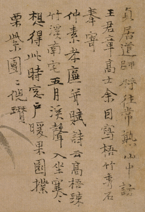 倪瓒《梧竹秀石图轴》(图4,藏于故宫博物院)自题:“贞居道师将往常熟山中访王君章高士,余因写梧竹秀石,奉寄仲素孝廉,并赋诗云:高梧疏竹溪南宅,五月溪声入坐寒。想得此时窗户暖,果园扑栗紫团团。倪瓒。”又元张雨题诗:“青桐阴下一株石,回棹来看(此字缺失)未消,展图仿佛云林影,肯向灯前玩楚腰。写此纸附老仆至蒲轩,即景书图上。雨。”贞居道师应是张雨(1283-1350年),元代文人,精诗文、书法、绘画,曾受学于虞集,旧名张泽之,一名天雨,字伯雨,号句曲外史、山泽臞者;茅山派道士,道名嗣真,道号贞居子,钱塘(浙江杭州)人。传世书迹有《台仙阁记》(藏于上海博物馆)、《题画二诗》(藏于故宫博物院);著有《贞居集》(《句曲外史集》)五卷。