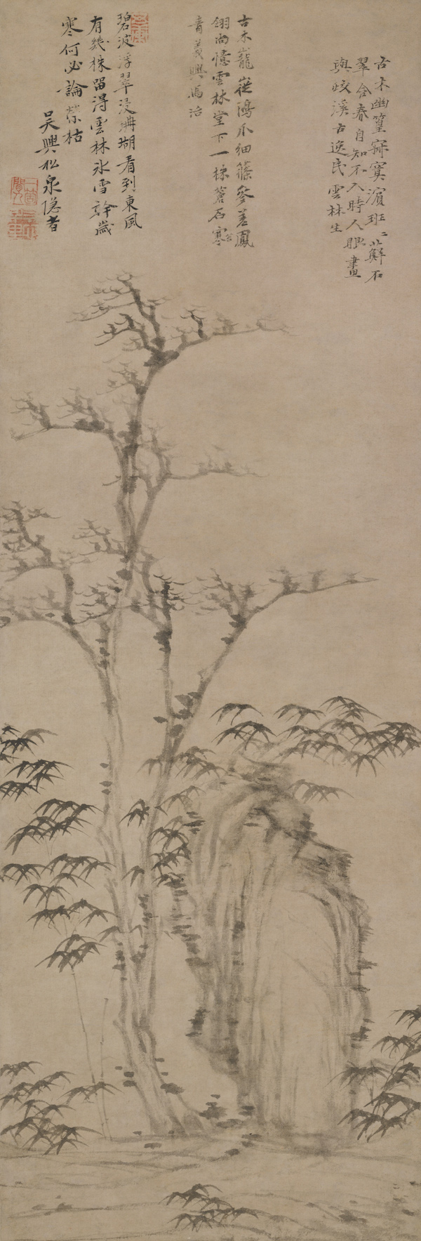 倪瓒的《古木幽篁图轴》(图5,藏于故宫博物院)明显受到赵孟頫“石如飞白木如籀,写竹还于八法通”理论的影响,并且将强烈的隐逸情感发乎于自题诗中:“古木幽篁寂寞滨,班班藓石翠含春。自知不入时人眼,画与蛟溪古逸民。云林生。”本幅另有题诗:“古木巃嵸鸿爪,细蓧参差凤翎。尚忆云林堂下,一株苍石苔青。义兴马治。”“碧波浮翠浸珊瑚,看到东风有几株。留得云林冰雪干,岁寒何必论荣枯。吴兴松泉隐者。”