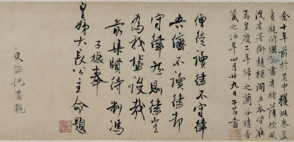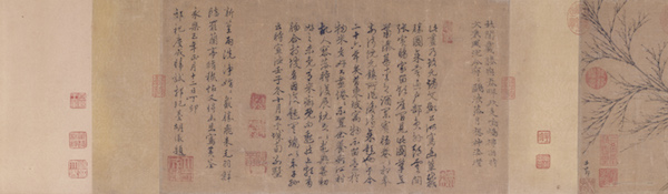 中国绘画中的“文人画”在元代兴起,其显著特征就是超越了绘画以形取象的功用,强调并重视笔墨的运用,以书入画。赵孟頫有题画诗:“石如飞白木如籀,写竹还于八法通;若也有人能会此,方知书画本来同。”(见元·赵孟頫《秀石疏林图轴》自题,藏于故宫博物院)这首诗既是对唐张彦远“书画同体而未分,无以传其意,固有书;无以见其形,固有画” (唐·张彦远《历代名画记》)。这首诗既是对“书画同体”理论的很好阐释,同时也反映了元代文化书画实践中的真实情况。元代画家们以书入画,大大地发展了文人画,甚至可以说不善书就不算是真正意义上的文人画家。所以元代不仅有书画具负盛名的赵孟頫,即使是以画名世的钱选、黄公望、王蒙、吴镇、倪瓒等著名画家,亦善书法,但却没有或少有独立存在的书法作品,甚至于以画掩其书名,但从其画上的题诗、题跋仍可见其画法的风貌和成就。