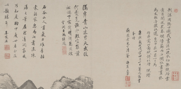 王翬早年专仿黄公望,深得二王提点,王鉴收他为弟子,后又介绍认识了王时敏,王时敏称赞他:“集古人之长,尽趋笔端,故能妙绝千古。前诸之作,固足乱真,此则更为脱化,每仿一家曲尽其致,而超逸之趣则又过之。”王翬有《临倪瓒荆溪清远图轴》、《仿倪瓒山水轴》(藏于故宫博物院)(图12),墨笔画远渚近树,临倪瓒原款识并题曰:“荆溪周隐士,邀我画溪山。流水初无竞,归云意自闲。风花春烂漫,藓雨石斓班。书画终为友,轻舟数往还。至正甲辰四月一日为伯昂写此图,赋诗以赠,倪瓒。康熙岁次戊寅四月一日摹迂翁笔奉赠蘅圃老先生清鉴 ,海虞王翬。”又有王鸿绪、姜宸英两段题跋:“隔岸青山遶碧天,武陵何处觅渔船,数家篱落松林下,窗对晴湖万顷烟。云间王鸿绪题。” “石谷山人画气力雄厚,括囊诸家,忽为此萧洒疏澹之笔,居然清閟家风,乃知胸中度世者正在韵胜耳。姜宸英。”姜宸英的题跋一语中的,既说出了王翬的画风全面,又对此画评价甚高,有倪瓒疏澹画风,以韵致取胜。