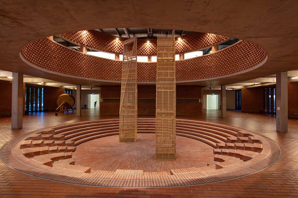 炎炎夏日,踏进北京的红砖美术馆中式园林风格的圆拱型大门,首先映入眼帘的便是矗立在大厅地陷广场内的装置作品《无题 2010(北京国贸第三期;上海环球金融中心)》,创作者里克力•提拉瓦尼,在新千年后一直关注法国境遇主义中都市化、景观社会等话题——很显然,在中国日新月异的城市化进程中,他找到了更合适的抓手。这两件用竹子搭建的摩天大厦模型,本身是对经济全球化浪潮的观照,媒材却又非常的东方中国。