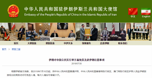 中国驻伊朗大使馆30日发布消息,确认伊朗对中国公民实行单方面免签入境政策。