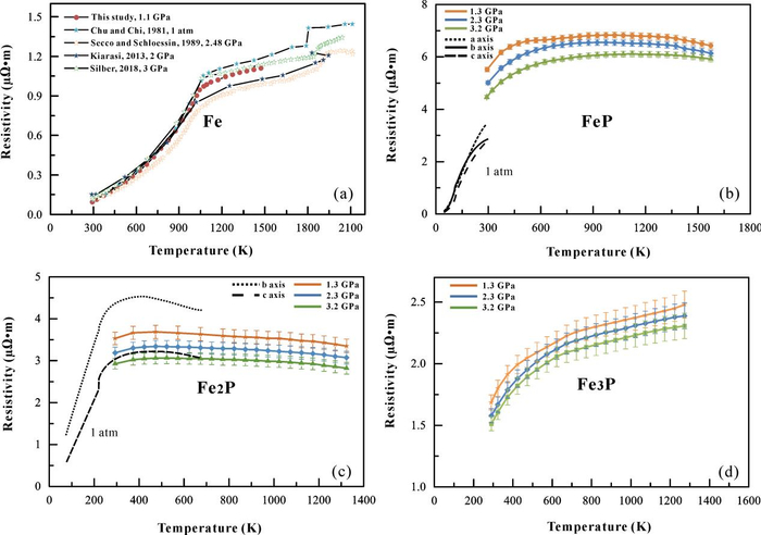 图1. 不同温压条件下Fe、FeP、Fe2P和Fe3P的电阻率