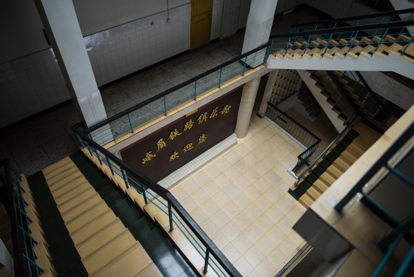 铁路人陆续离开,桂花桥镇也随之衰落。前进路与友爱路交汇处一桩六层高的楼房,是桂花桥镇的地标建筑,立面上方用繁体写着“前进西楼”。走到附近的峨眉铁路俱乐部,大楼内陈旧的格局,昏暗的光线,折叠向上的楼梯,让人觉得像在玩密室逃脱。不同层楼上分布着台球室、篮球场、乒乓球室、太极协会、舞厅、图书室、音乐室、书法协会,门上挂着个不知何处颁发的“三星级俱乐部”的牌子,以及“铁路职工、家属凭卷入场活动”的公告。