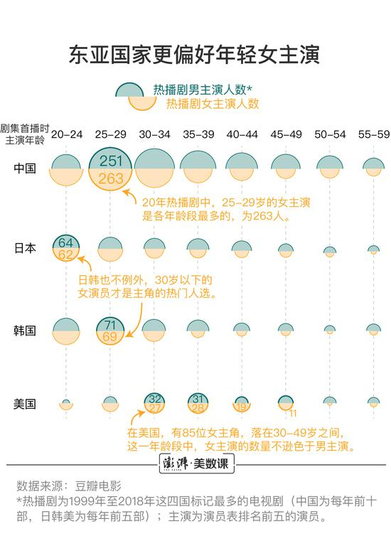 统计结果显示,在中日韩三国的电视剧中,30岁以下的女演员是主角的热门人选,而在美国30-50岁的女演员还有很多机会担纲女主演。