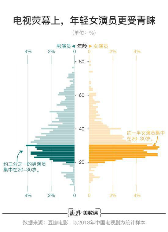 即便部分中年女演员强势逆袭,但演员年轻化仍然是整个影视行业的广泛追求。澎湃新闻(www.thepaper.cn)爬取2018年所有中国电视剧中的演员信息,我们发现,在中国的电视荧幕上,有一半的女演员集中在20-30岁。而在这一年龄段的男演员大约只占整体的三分之一。