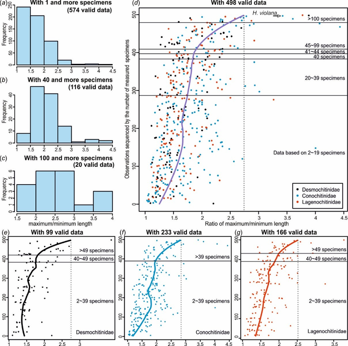 为了进一步探索几丁虫形态差异的幅度及其生物学属性,研究人员收集整理了前人发表的57属(目前已知报道的所有属)378种几丁虫的最大最小壳长比以及来自现代水生6门10纲45种无脊椎动物卵的大小差异值进行了类比研究。结果显示,当度量标本的数量足够时,几丁虫壳体的大小差异明显大于现代水生无脊椎动物卵的大小差异,说明其为后生动物的卵的可能性极低,更可能为一类独立的微体生物。