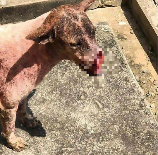 从早前网络上传播的图片中我们可以看到,一只可怜的小狗在马来西亚沙巴的街道上晃荡,而狗狗被砍掉的口鼻部分完全暴露在空气中。还有一张照片是掉在草地上的口鼻,可以清晰地看到狗的鼻子和门牙。