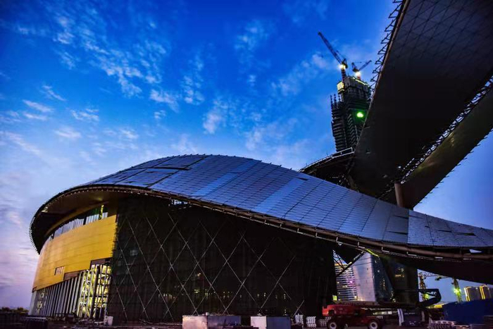 吴江之畔,太湖之滨,一座兼具江南特色与国际风格的建筑初展风姿。建筑穹顶,两块巨大金属装饰如丝绸缎带,起伏交织延伸至天空与水面。据悉,总建筑面积约21.5万平方米的苏州湾文化中心将于2020年投入运营,有望成为吴江乃至长三角地区的文化新地标。