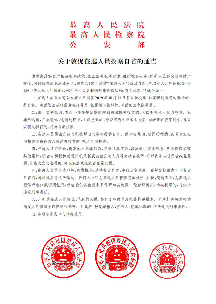 敦促在逃人员投案自首的通告