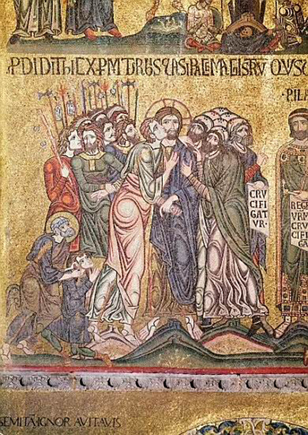 东方教会的这些背景知识比较专业和具体,电视剧中虽然张冠李戴也不足为怪。但道具组对景教寺内部画像的选择就有些欠考虑了。在第二十集中,张小敬和檀棋造访景教寺,伊斯前来迎接他们。三人所站之处设立着一幅巨大的画像《犹大之吻》,上面有非常漂亮的金色镶嵌画。然而,这一金色镶嵌画圣像的原籍并不是波斯,而是意大利威尼斯的圣马可大教堂(St Mark's Basilica)。它是第一穹顶和中央穹顶之间拱壁上五幅画中的第一幅。圣马可大教堂采用了拜占庭风格的建筑和绘画风格,但使用的文字仍然是拉丁语。比如画中一人手持板子上写的crucifigatur(钉他十字架)。圣马可大教堂内部绘画是十二至十三世纪完成的,远远晚于唐代景教。而且景教的礼仪语言是叙利亚语,不会出现拉丁语旁白。这个是明显的穿帮。