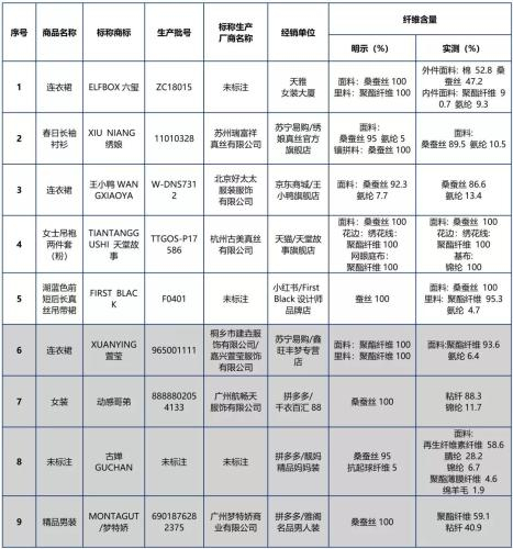 在纤维含量上,100款样品中有9款样品的纤维含量实测值与吊牌明示不符,其中3款网页与吊牌均明示为桑蚕丝的样品,1款网页明示桑蚕丝、吊牌明示为聚酯纤维的样品,实测不含桑蚕丝,涉嫌假冒;1款明示为桑蚕丝面料的样品,实测桑蚕丝含量仅为47.2%,涉嫌以次充好。