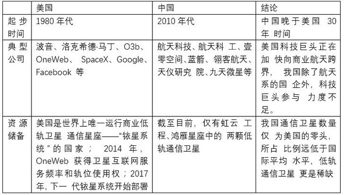 我国商业航天起步时间较晚,且资源储备相对不足。2014 年底,我国政府提出鼓励民营企业进入卫星市场;2015 年,随着卫星领域军民融合发展国家战略的提出,越来越多的民营企业参与到商业航天中,专注于火箭和微小卫星制造。此外,我国低轨通信卫星频率和轨道资源申请和储备情况也落后于美国。