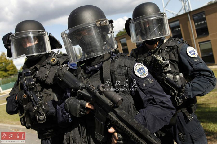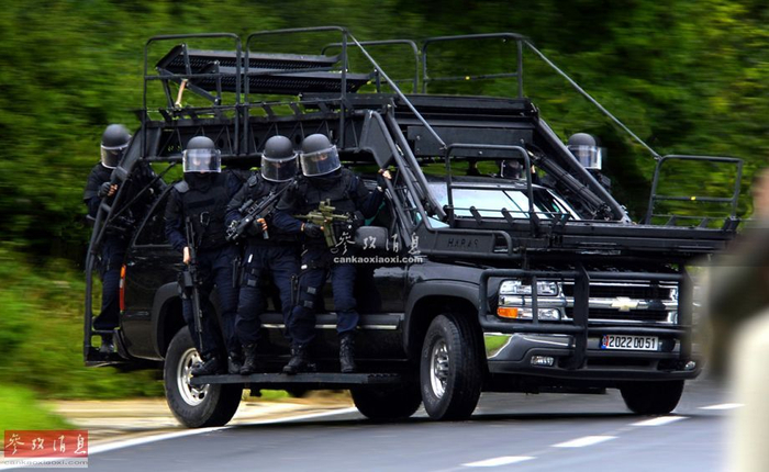 GIGN总部位于法国伊夫林省的萨托利市,兵力规模387人(号称世界规模最小的特战队),下辖6支部队,其中“武装干预部队”为突击主力,下辖100人,分为4个突击排(其中2个排处于“永久值班”状态),最小单位为突击小组,每组5人。图为搭乘突击梯强攻车的GIGN队员。